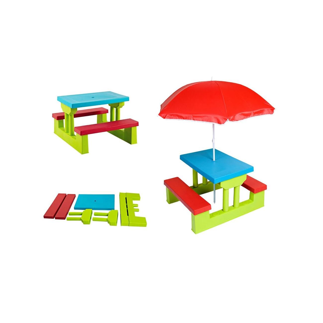 Otroški set mize in klopi – idealen za igro, barvanje, piknik in druženje na prostem, z zaščito pred soncem. Enostavno ga premaknete v sobo za risanje, učenje in igro. Zasnovan v živahnih barvah, udoben in funkcionalen. Popolno darilo za male ustvarjalce!
