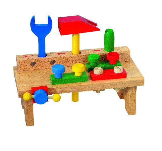 Drevesna mizica za orodje vsebuje izvijač, kladivo, ključ, matice in vijake. Igrača pomaga razvijati tehnično razumevanje in fino motoriko. Izdelek izpolnjuje zahteve EU za varnost igrač in je primeren za otroke od 3. leta starosti dalje.