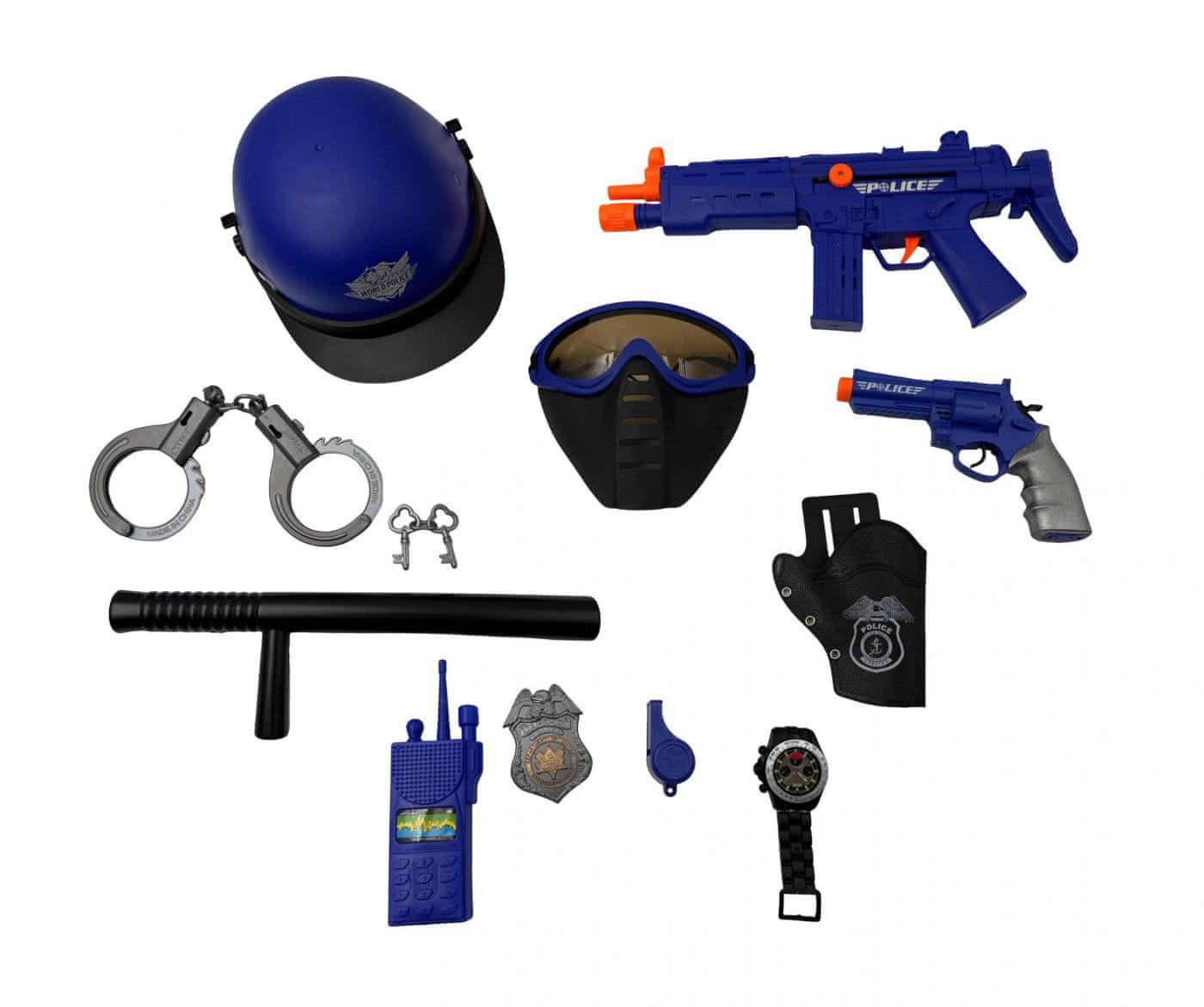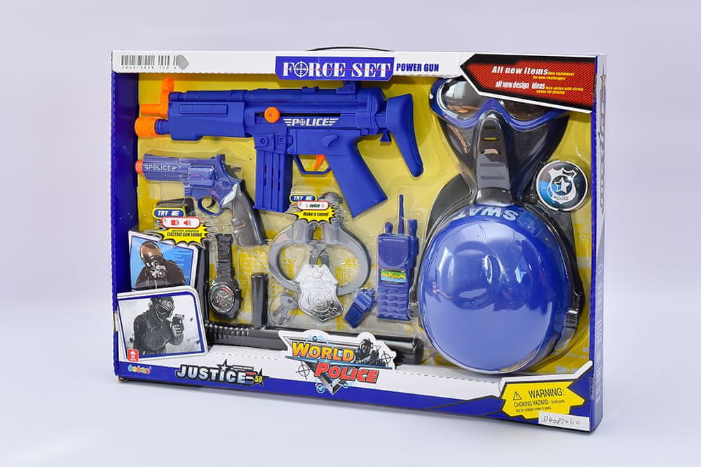 S čelado se lahko otroci počutijo kot pravi policisti in branijo pravico. V kompletu so tudi lisice, palica, ura in drugi ključni dodatki.