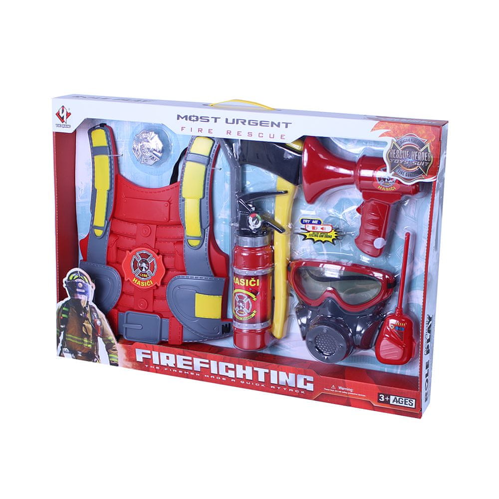 Izkusite pravo reševalno akcijo s tem super gasilskim kompletom! Dodatki, ki jih boste zagotovo potrebovali! Komplet vključuje gasilni aparat, ki ga lahko napolnite z vodo, telovnik, gasilsko značko, radio, sekiro, lomilko, masko za obraz in nepogrešljivi megafon, da vas bodo vsi slišali. Megafon se napaja z dvema baterijama AG13, ki sta vključeni v izdelek.