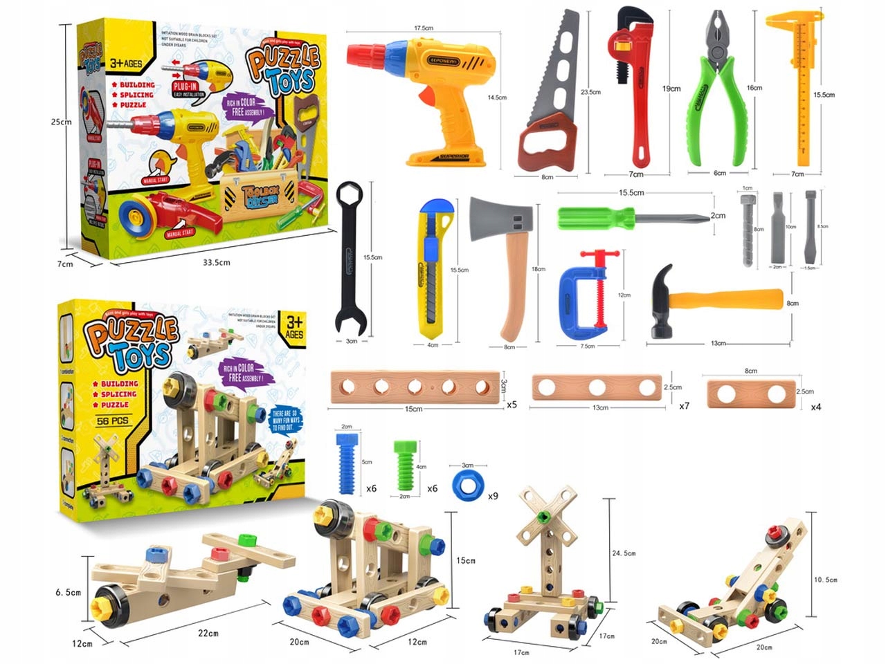 SLIKE PRIKAZUJEJO VSE, KAR JE VKLJUČENO V KOMPLET, IN DIMENZIJE PRIMERNIH STRUKTUR.