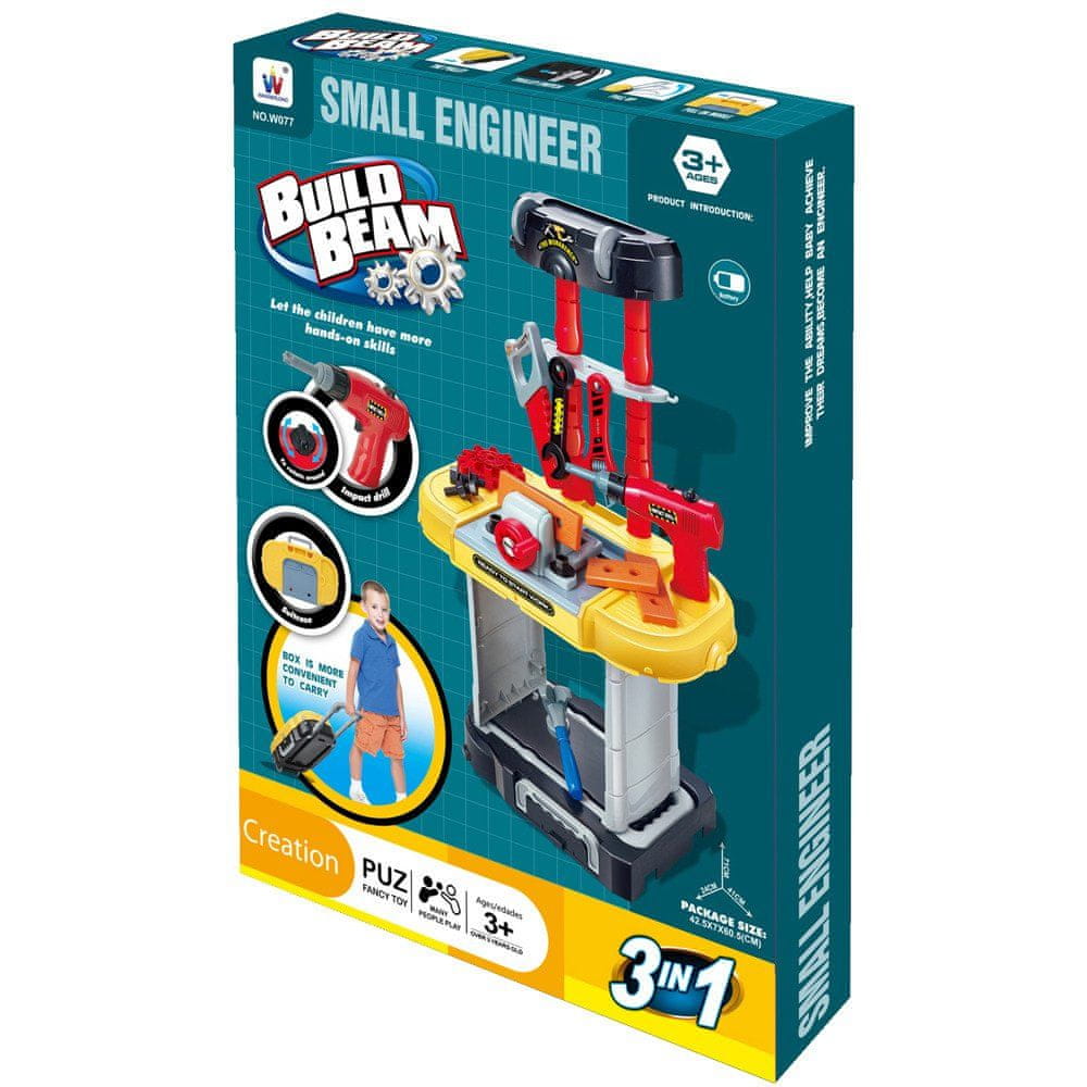 Komplet Little Tinkerer's Kit bo vašemu otroku prinesel veliko zabave in pozitivno vplival na njegov razvoj. Razvija se petljanjeročne spretnostiindomišljija. Edinstven dizajn omogoča, da se delavnica zloži vkovček na koleščkih,tako da lahko vaš malček vzame svojo igračo kamor koli želi.