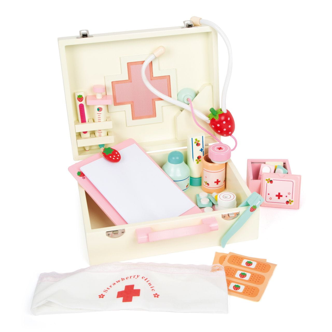 Leseni pisani kovček za malo medicinsko sestro vsebuje 24 kosov raznobarvnih lesenih dodatkov, vključno s tekstilnim naglavnim trakom z rdečim križem. V kovčku je vse, kar potrebuje vsak zdravnik – termometer, stetoskop, brizga, mazila, zdravila … Vse je narejeno iz lesa. Motiv jagode na posameznih instrumentih dopolnjuje veselo obliko. Glavneznačilnosti: vsebuje 24 kosov zdravniških instrumentov in pripomočkov spodbuja ustvarjalnost in komunikacijo