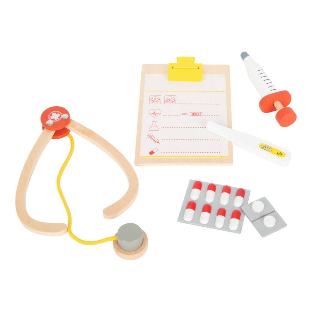 Zobna gniloba ne bo imela možnosti! Kovček za ključavnice navdušuje z lesenimi dodatki z lepim dizajnom. Otroška brizga, vrtalnik, zobna ščetka, zobna pasta in klešče – ta leseni komplet otroškega zobozdravnika ima vse! Dva siva zoba bosta otroke naučila, kako pomembna je zobna higiena. S termometrom, balzamom, pinceto, tabletami in beležko je kovček odličen tudi za igro zdravnika. Popolna igrača za pripravo otrok na prvi obisk pri zobozdravniku ali zdravniku. Otroci se lahko igrajo zdravnika, ta igra spodbuja ustvarjalnost in otrokom daje pogum. Vsi pripomočki se priročno namestijo v kovček. Odprite svojo ordinacijo! Glavne značilnosti Lesen kovček s ključavnicoTermometer, balzam, brizga, pinceta, tablete, model zobaPrijetna otroška oblika
