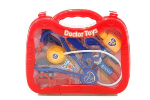 Zdravniški kovček velikosti približno 26 cm X 21 cm, ki vsebuje fonendoskop, brizgo, očala, škarje in drugo orodje za male zdravnike.Starost 3+