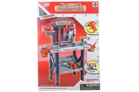 Velik plastični ponk z orodjem. Paket vsebuje ponk, ki meri približno 69 × 26,5 × 75 cm, baterijski vrtalnik, primež, klešče, žago, kladivo, ključe in druge pripomočke. Vrtalnik se napaja z 2 baterijama AA (nista vključeni). Dimenzije paketa približno 36,5 × 53 × 13 cm. Starost 3+