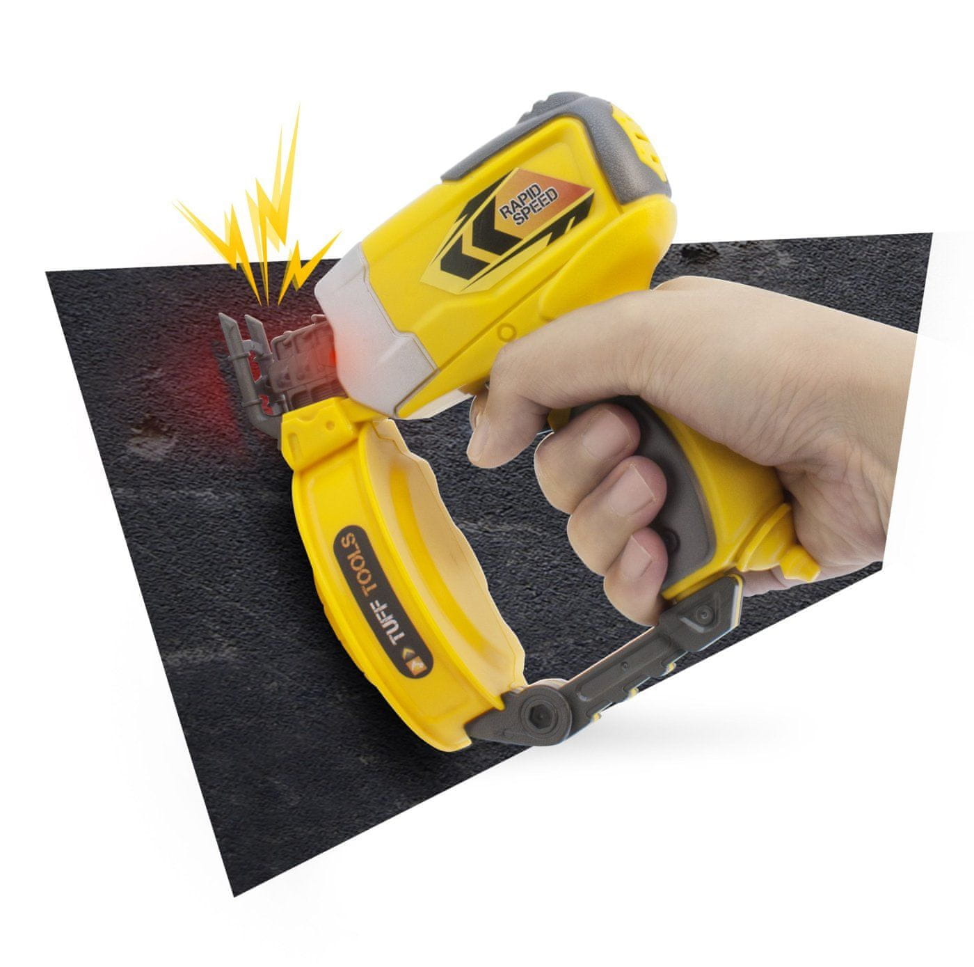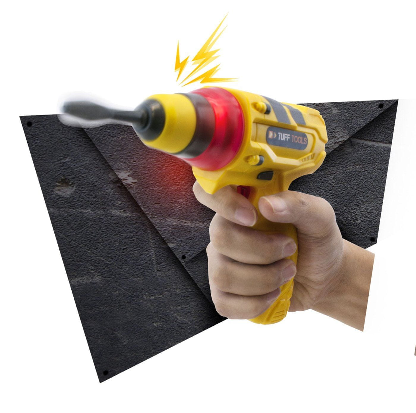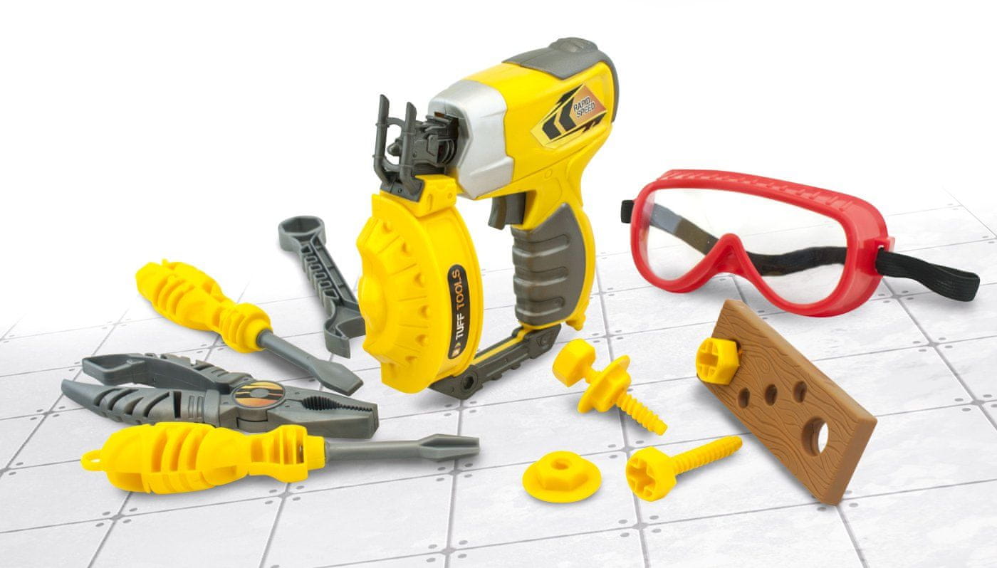 Komplet orodja Tuff Tools z očali. Vsebina paketa – električni vrtalnik s svetlobnimi in zvočnimi učinki, očala, vijaki z maticami 6 kosov, 4 izmenljivi vrtalniki in izvijači, ključ, žaga, kladivo. 3×AG13 priložene baterije.