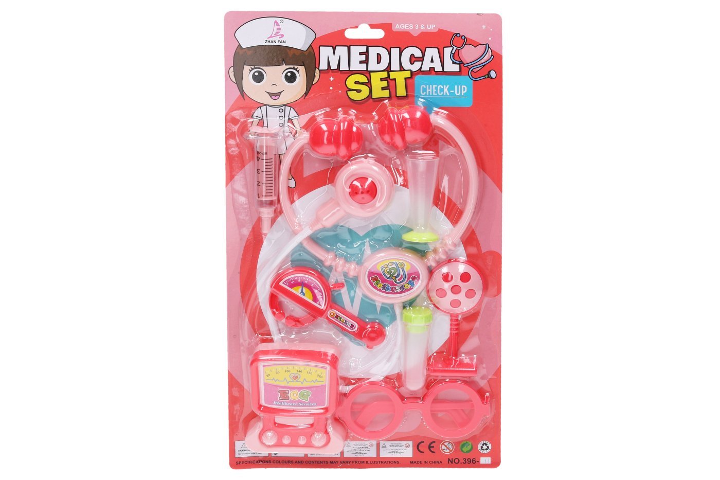Zdravniški komplet. Vsebina paketa – stetoskop, epruveta, brizga, ekg, očala in drugo. 2 različici – roza, modra. Celoten opis