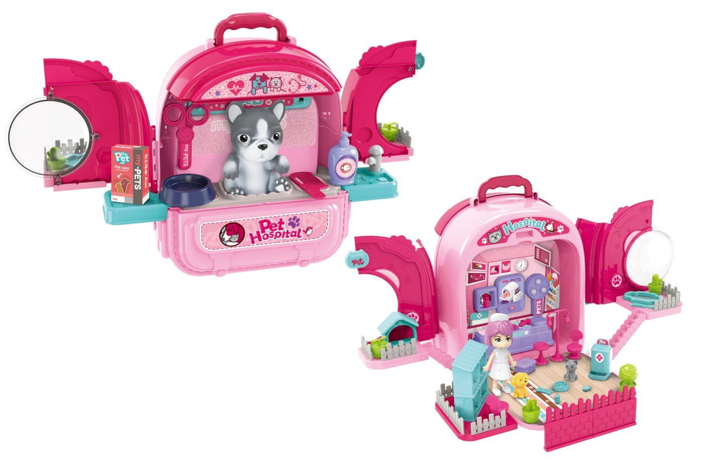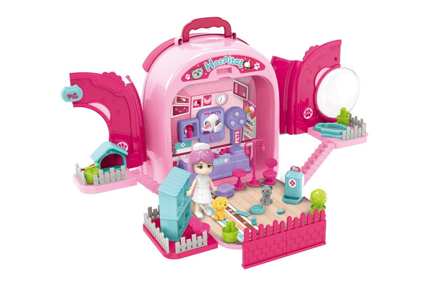 Živalska bolnišnica v nahrbtniku za pse. Dimenzije 50×35×30 cm. Velikost psa 17 cm. Nahrbtnik se odpira z dveh strani. Paket vsebuje opremo živalske klinike, figurico psa in dodatke: skledo, stekleničke, lutko medicinske sestre, drobnarije za kliniko.