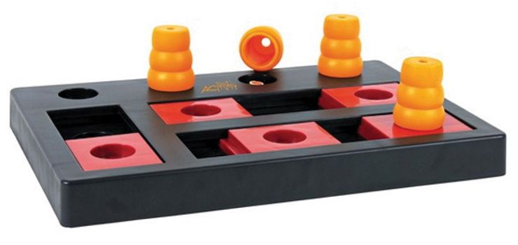 Igra je sestavljena iz dveh vrst predalov z luknjami in štirih figur, v katere lahko za večjo motivacijo psa skrijete manjše priboljške.