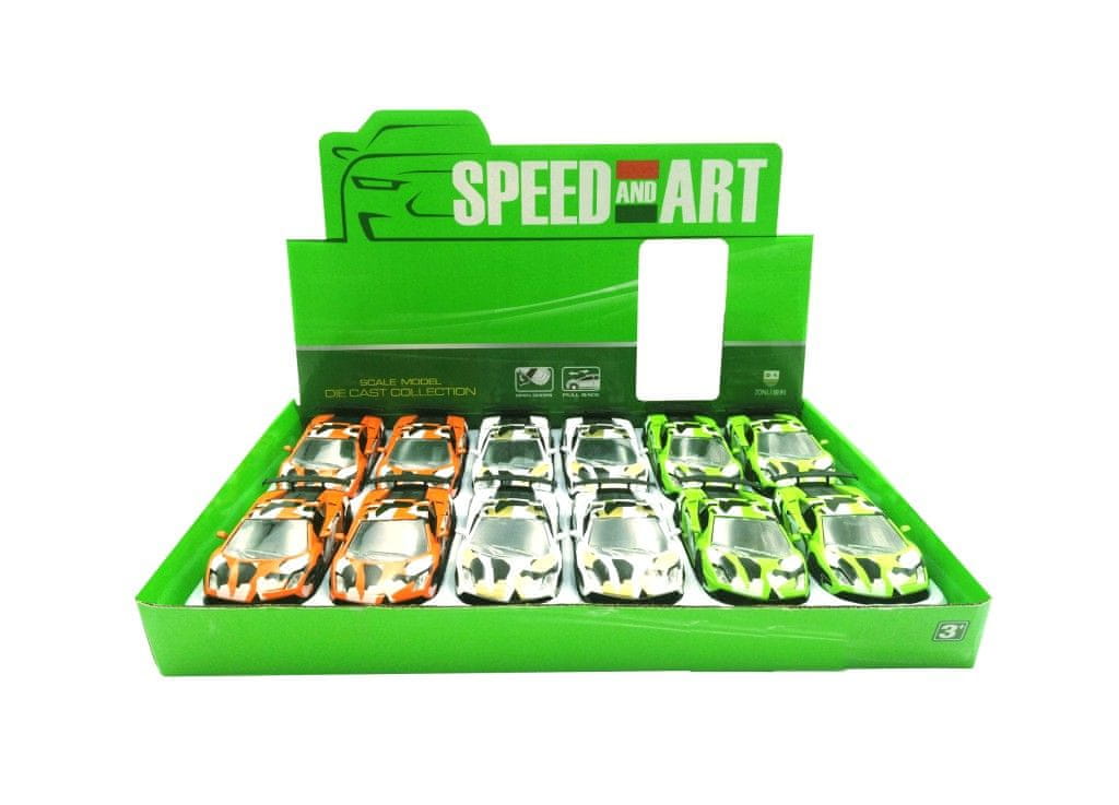 Kovinski model športnega avtomobila v 3 izvedbah, ki lahko odpira vrata. Funkcija povleci nazaj – potegni in pojdi.