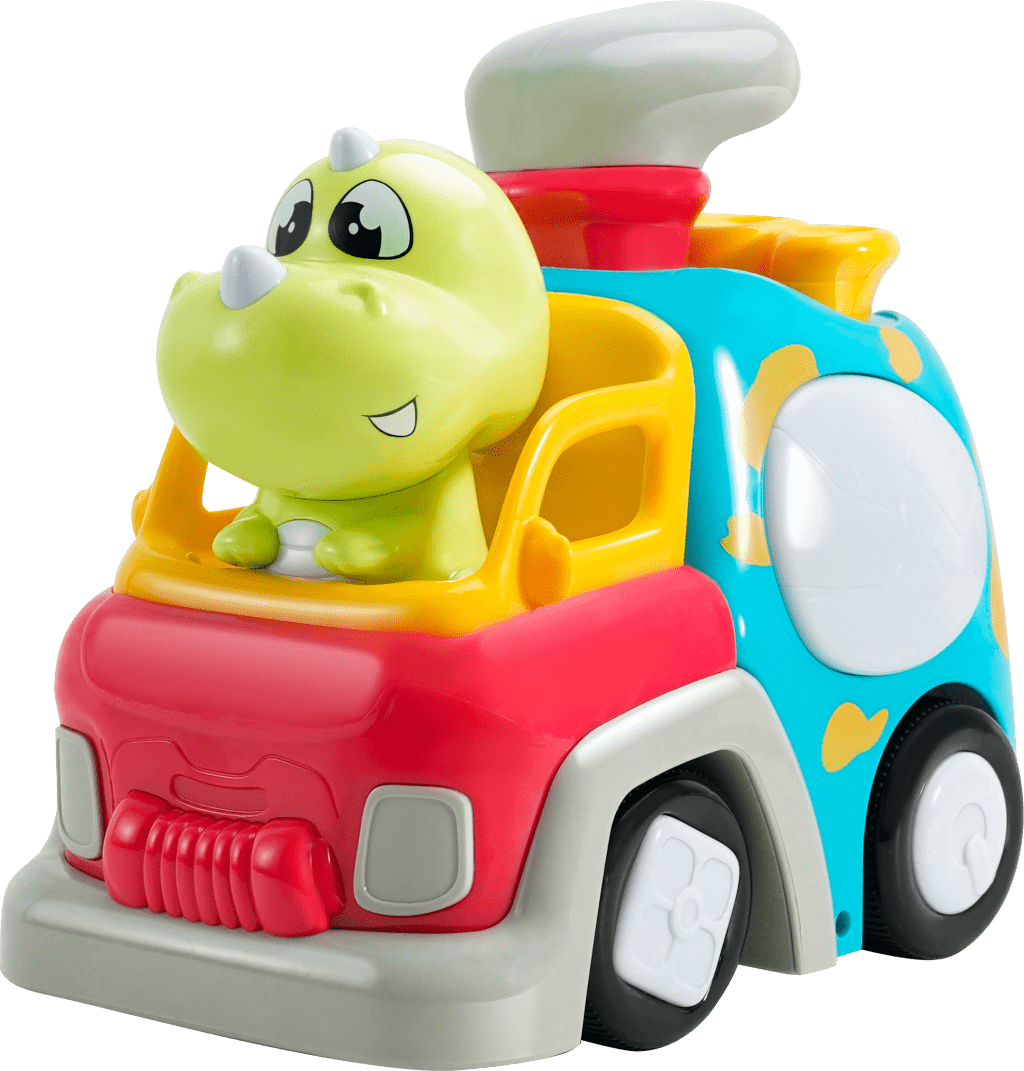 Zabavna igrača Kiddy Go! z dinozavrom. Avtomobil se prižge in oddaja zvok, ko pritisnete gumbe na zadnji strani avtomobila, avtomobil potrebuje baterije 3×AA, ki so priložene. Kolesa v prostem teku. Primerno za otroke od 18 mesecev dalje.