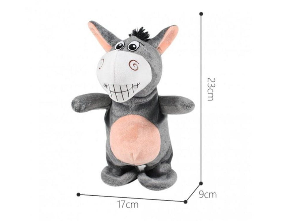 Prikupen osel, ki hodi in celo govori! Nov klepetavi prijatelj za vaše otroke! Samo pogovorite se z njim in ponovil bo vaš stavek točno tako, kot ste ga rekli. Prijeten plišast material in interaktivnost tega ljubljenčka bosta očarala in zabavala vsakega otroka. Visok je 23 cm in deluje na 3 AAA baterije, ki niso priložene v paketu.