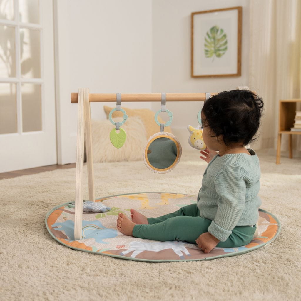 Vzpostavite varno in igrivo okolje za svojega otroka na podlogi, ki raste skupaj z njim! Ta igralna odeja Wonder & Wood ponuja tri stopnje igre: ležanje, čas na trebuščku in sedenje. Poleg tega se sodobna lesena zasnova z A-okvirjem prilega vsakemu dekorju in se zloži brez orodja – kot nalašč za dom ali potovanje. Vse igrače so zasnovane tako, da razvijajo čute, raziskujejo oblike, teksture in zvoke. Z obročki C jih je mogoče enostavno sneti in pritrditi na voziček, avtomobilski sedež ali stol. Idealno darilo za otroško zabavo, rojstni dan ali za vsakodnevno udobje.