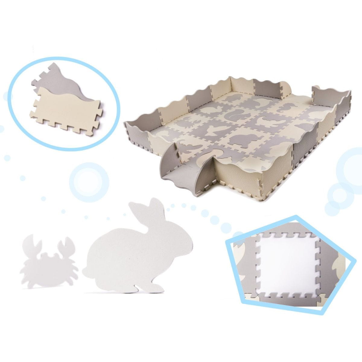 Penaste sestavljanke – igralna podloga in otroška posteljica v enem, odstranljive oblike in živali, mehka EVA pena, nedrseča in vodoodporna površina, možnost ustvarjanja 3D oblik Celoten opis