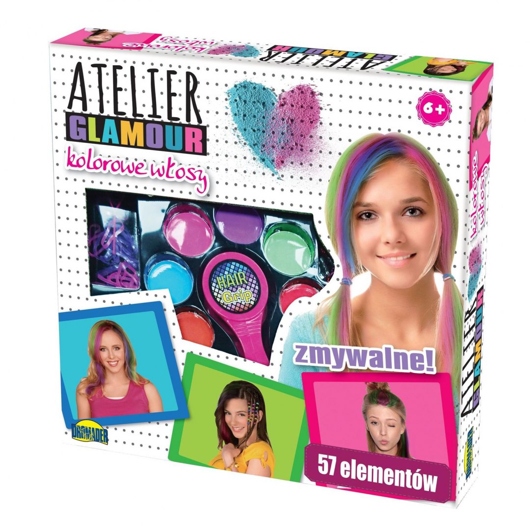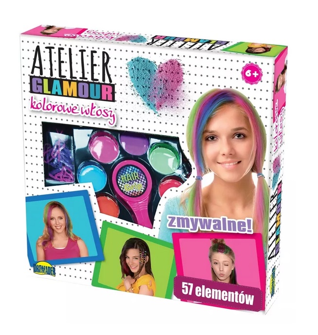 Komplet za okraševanje in barvanje las. Nanesena barva se enostavno spere. Poleg ustvarjanja pisanih pramenov lahko pričesko tudi okrasite s priloženimi dodatki (58 kosov). Vse je pakirano v okencu z grafiko. Komplet vsebuje: