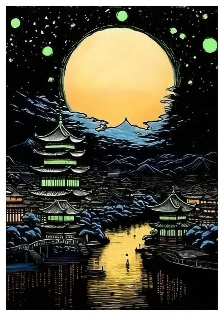 Odkrijte orientalsko pokrajino s to fluorescentno sliko s praskami, ki prikazuje pagodo ob mirni reki, obsijani z mesečino. Preprosto obrišite zgornjo plast, da razkrijete celotno barvo in se čudite, ko se slika sveti v temi!