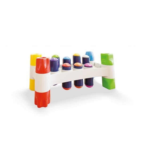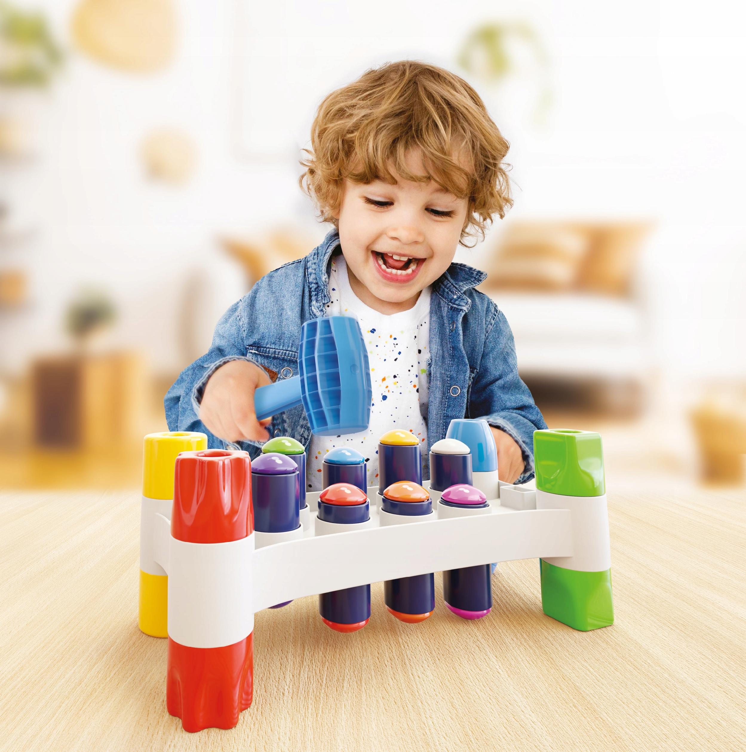 Otroci se zelo zabavajo, ko s kladivom udarjajo po barvnih žebljičkih, in ko jih zadenejo vse, lahko začnejo znova in vsakič izmislijo drugačen vrstni red.