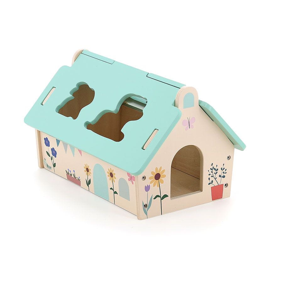 Kdo živi v tej slikoviti leseni hiši? Pes, miška, mačka in zajec. Sestavljanka v obliki hiše, ki jo je oblikovala Sarah Betz, bo navdušila vsakega otroka. Hiška v nežnih barvah s cvetličnimi motivi ima odstranljivo streho z oblikovanimi luknjami za vstavljanje živali. To je zgodnja igrača, ki jo je navdihnila Montessori. Med igro otroci razvijajo številne spretnosti, kot so koncentracija, spretnost, motorične spretnosti, potrpežljivost in koordinacija rok in oči. Učijo se, kako manipulirati z živalmi, da se namestijo v ustrezne luknje, in razvijajo svojo domišljijo že s samim igranjem s figuricami živali in hiško. Glavne značilnosti: hiška s snemljivo streho, 4 živali – pes, miška, mačka, zajecSarah Bethova presenetljiva zasnova, ki jo je navdihnila MontessoriRazvija spretnost, koordinacijo rok in oči ter potrpežljivostPodpira domišljijo in koncentracijo