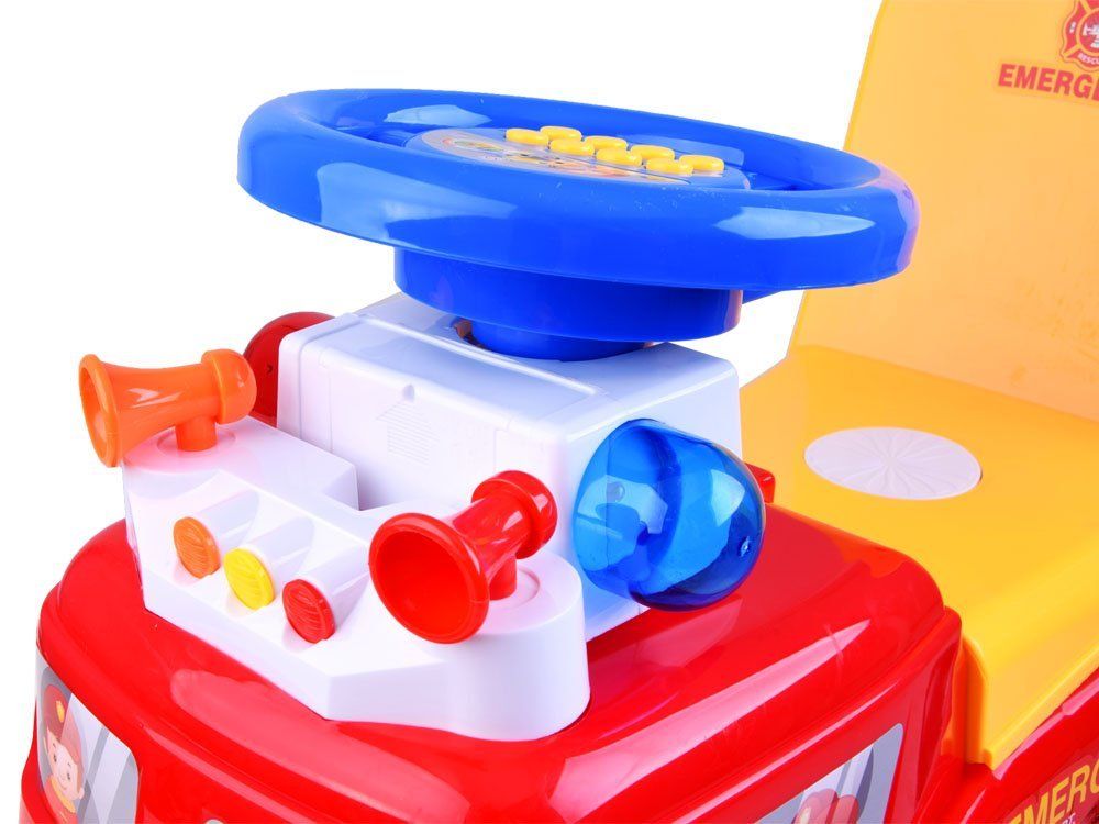 Vozilo je v celoti izdelano iz plastike. Avto ima udoben sedež z visokim naslonom, na zadnjem delu sedeža pa je košara za gasilske potrebščine. Avto lahko zavijete desno in levo. Pod volanom sta dva gumba, ki omogočata zvočni učinek gasilske sirene in modro-rdeči svetlobni učinek.