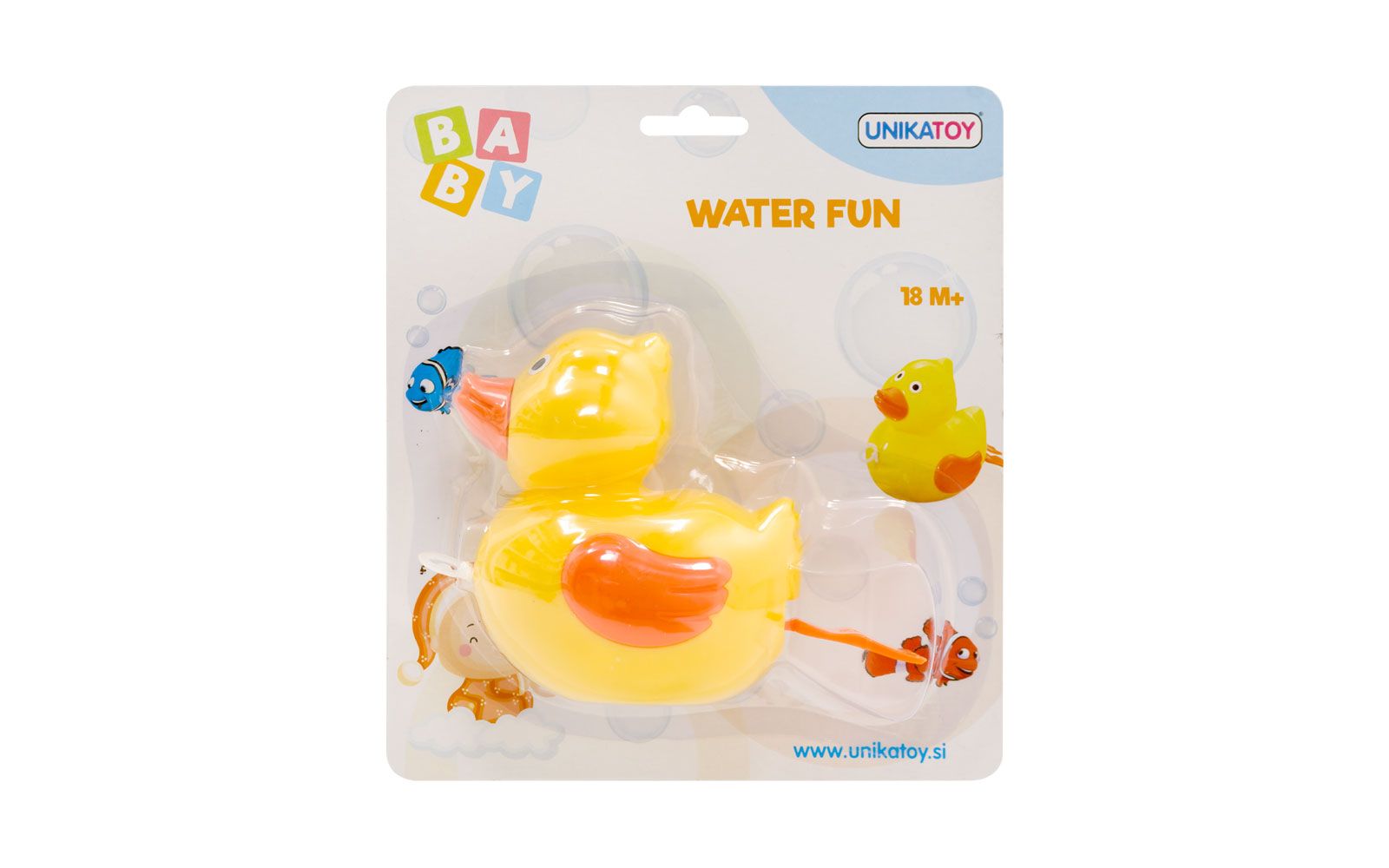 račka dolžine cca 14 cm romeno oranžne barve z vrvico na poteg. Položite račko v vodo, potegnite vrvico, spustite in račka se bo premikala po vodi. Priporočamo otrokom od 18. meseca starosti dalje – uporaba pod stalnim nadzorom odrasle osebe.