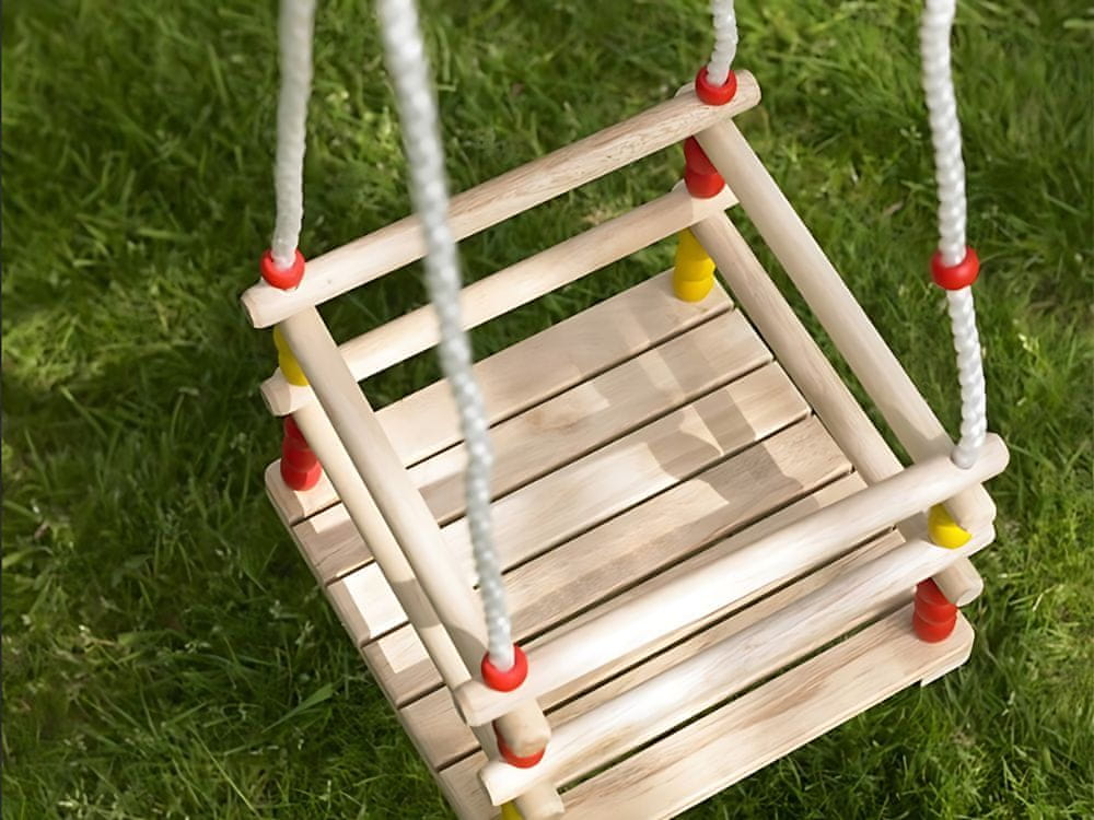 Material in dimenzije: Gugalnica je izdelana iz kakovostnega brušenega lesa, brez ostrih robov. Vrv je trpežna, dolžine ~1,7 m, z jeklenimi obročki za obešanje. Sedež meri 30 × 30 cm, višina ograjice ~20 cm.