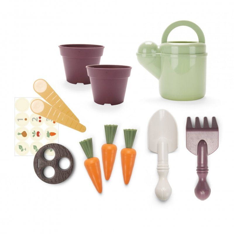 Lep stavni in igralni set v enem. Motivira otroke, da poskrbijo za svojo zelenjavo – tako za igračo kot za pravo! Vključuje korenčkove palčke, lopatko z lopaticami za rahljanje zemlje, zalivalko za zalivanje sveže posajenih semen in sadilne palčke, s katerimi si boste lažje zapomnili, kaj ste kam… Celoten opis
