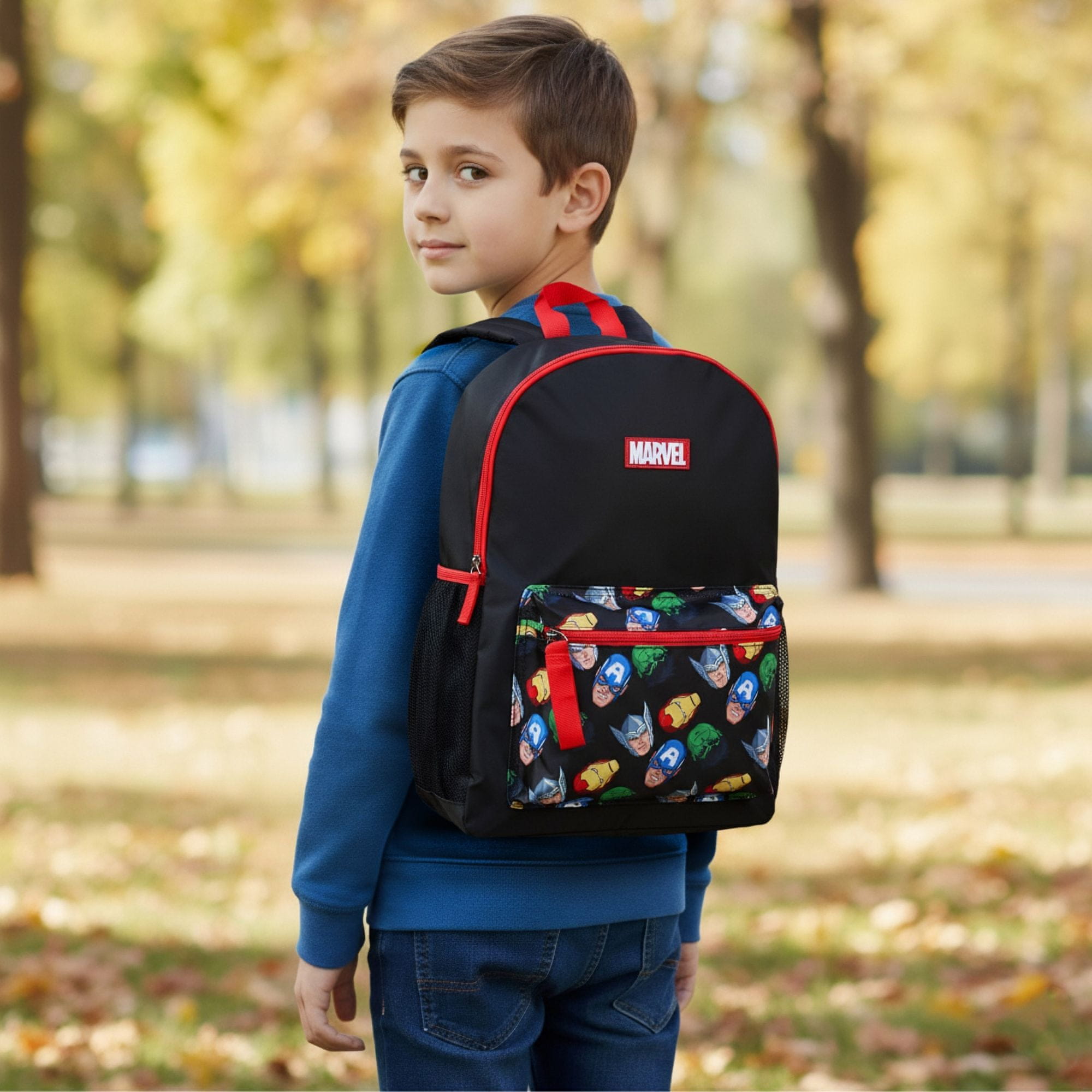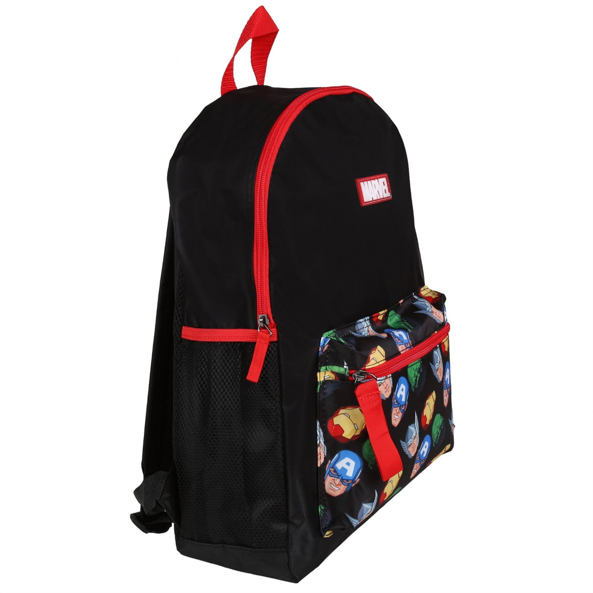 Na črni podlagi je na sprednjem žepu pisan potisk s podobami junakov Marvel, rdeča obroba na zadrgi in ročajih pa dodaja energičen videz.