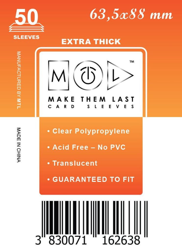Ovitki za karte Make Them Last – MTL oblikovani posebej za karte velikosti TTCG 63,5 × 88 mm. Ti zaščitni ovitki naredijo vaše karte trajne in odporne, ohranjajo jih sveže in svetle za številne igre. Vsebuje 50 ovitkov debeline 90 mikronov (Thick). Celoten opis