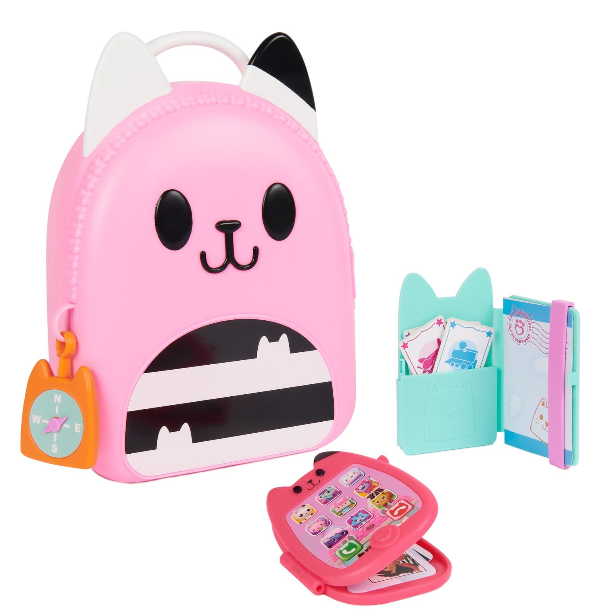 • Set vsebuje mobilni telefon – igračo, 1 kompas, 1 potovalno denarnico, 1 potovalne dokumente, torbico z motivom mucke.