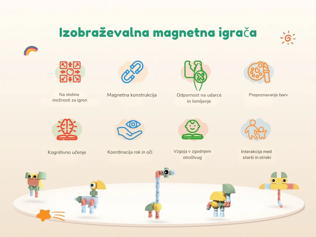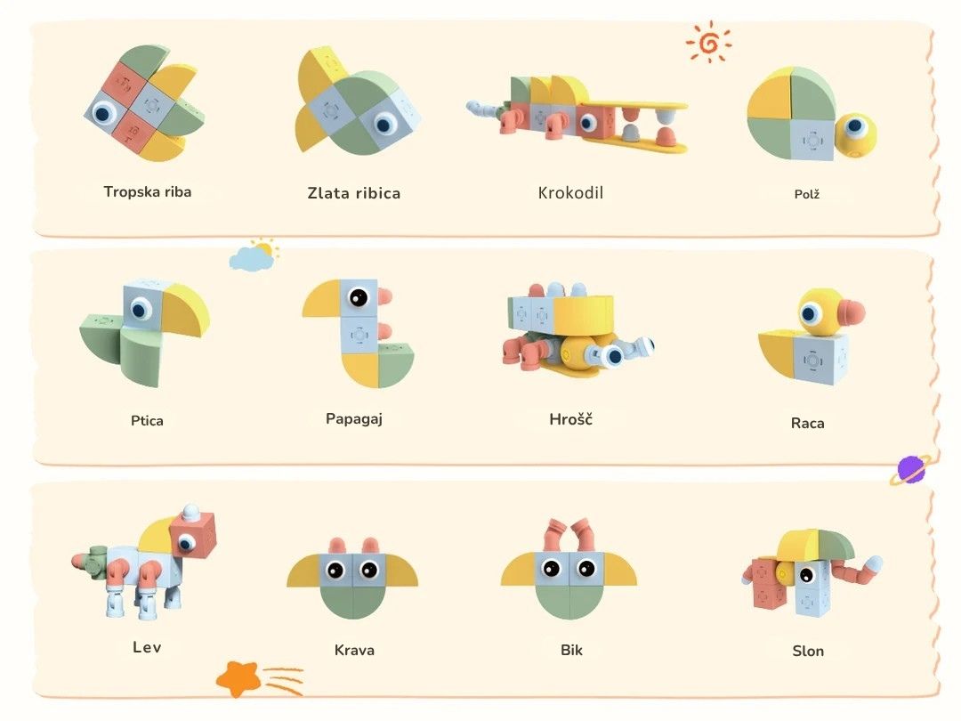 32 barvitih kosov z magnetnim sistemom za ustvarjanje živalskih figur in drugih modelov.