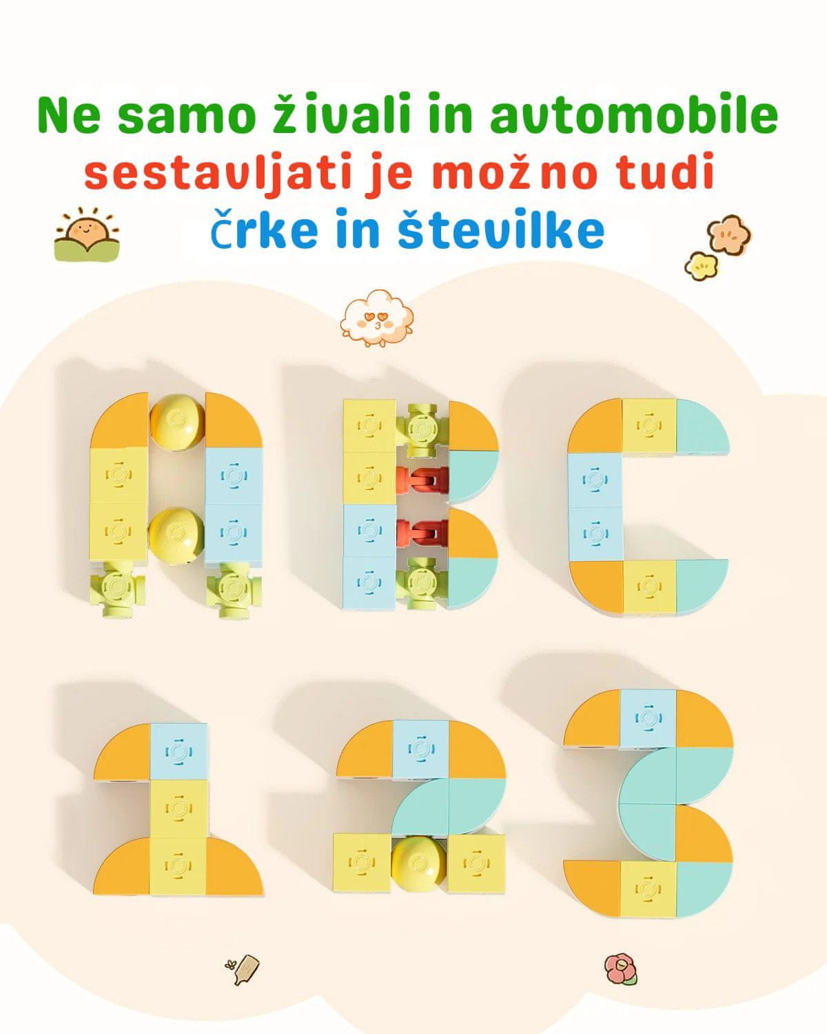 32 barvitih kosov z magnetnim sistemom za ustvarjanje živalskih figur in drugih modelov.