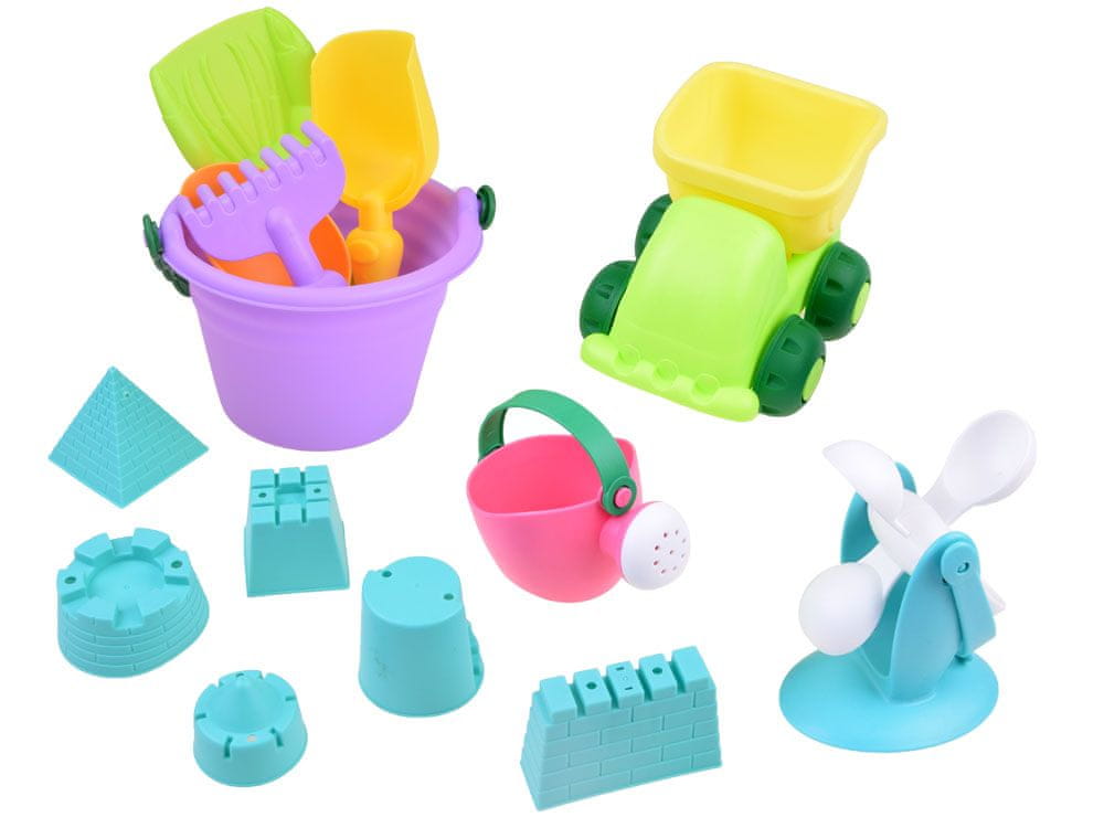 Set za pesek, vedro, avtomobilček, ki bo deloval tako pri igranju v peskovniku kot v kopeli. Igrača je izdelana iz barvne plastike, popolnoma varna za najmlajše otroke. Komplet ima veliko elementov, zahvaljujoč katerim zabava z njim ne bo hitro dolgčas. Očesu prijetne barve in zanimive oblike bodo zagotovo všeč vsakemu malčku.