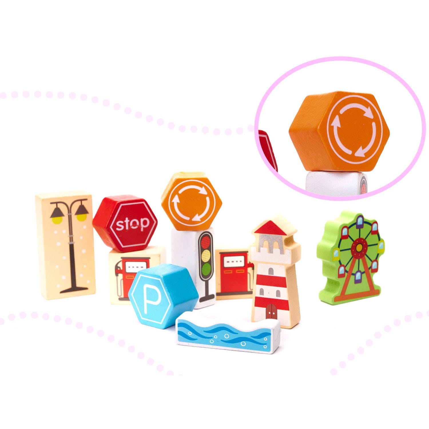 S tem kompletom lahko vaš otrok postane pravi arhitekt in uživa v ustvarjanju lastnih projektov. Bloki vključujejo stavbe, kot so bolnišnica, tovarna, hotel in gasilski dom, ter živali, kot so slon, žirafa in lev. V kompletu so tudi vozila, rastline, črke, številke in liki, kot so policisti in zdravniki. S sestavljanko s cestami je mesto zaključeno.