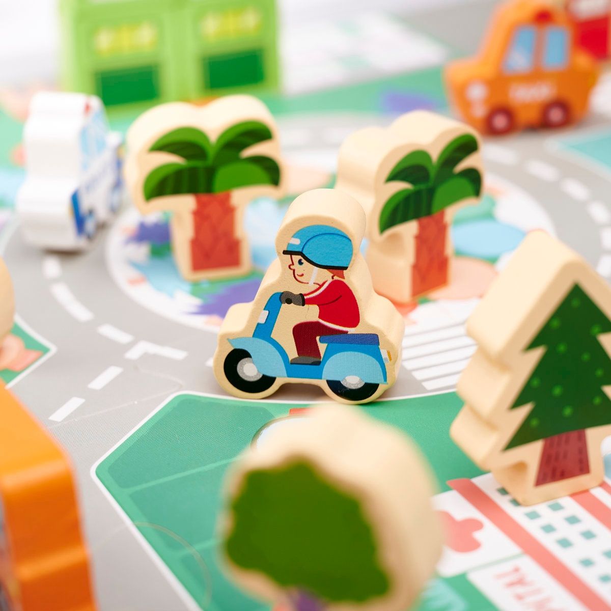 Skupaj zgradimo odlično sosesko ali kar celo mesto! S tem kompletom pisanih lesenih kock je to enostavno in zabavno.
