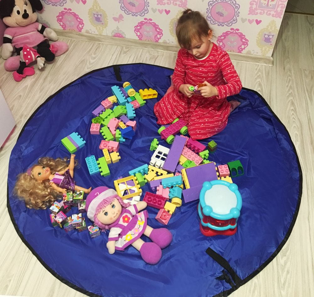 Organizator ima povišan rob, zahvaljujoč kateremu se kocke ali druge igrače ne razlijejo čez podlogo. Z eno potezo lahko odtrgate vrvico podloge, polne igrač, in vse zberete v praktično vrečko. Torba ima ročaj za nošenje/obešanje. Popoln za izlete – igrače lahko preprosto prevažate, otrok pa se bo imel kje igrati.