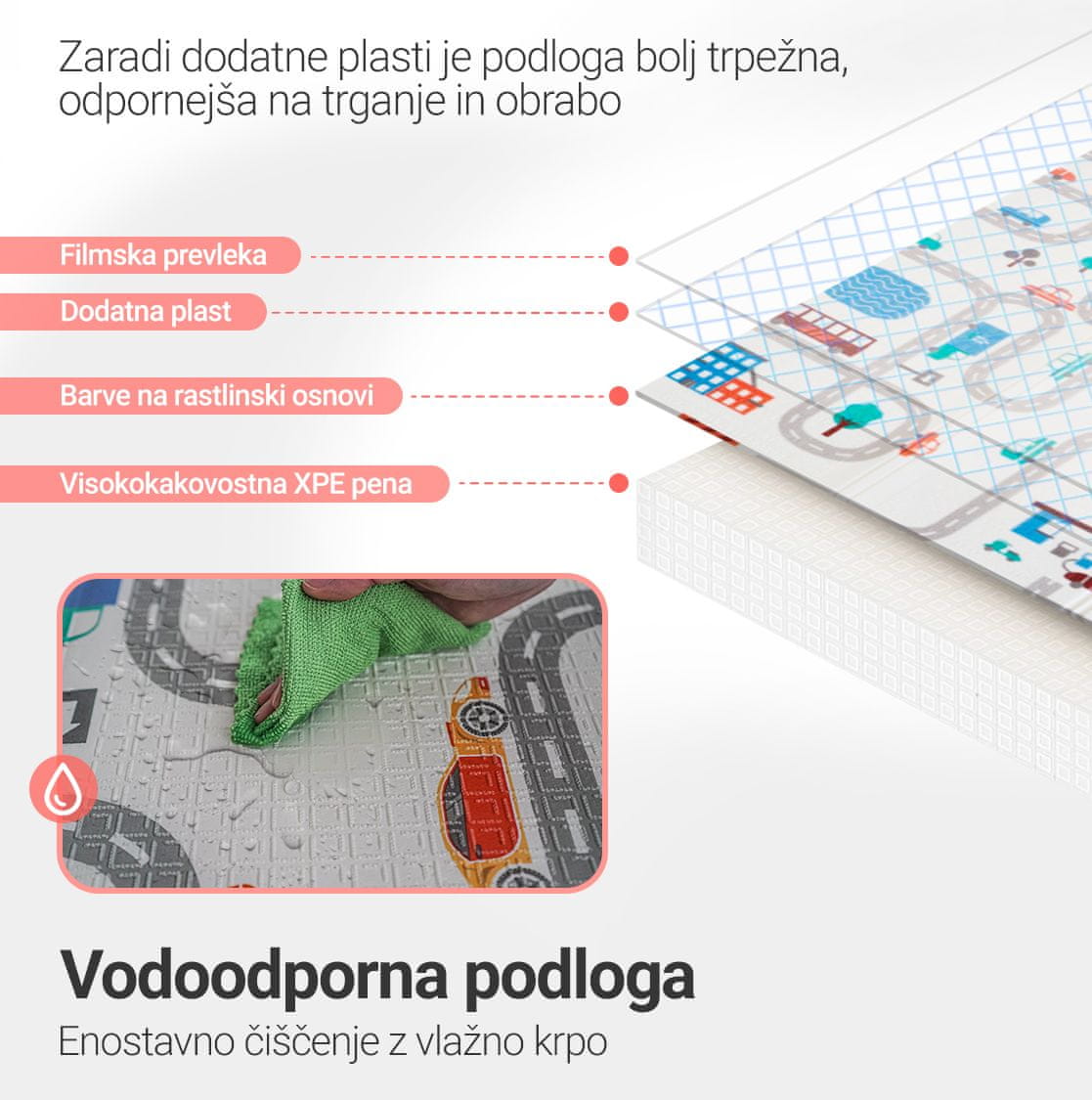 VODOODPORNO & ENOSTAVNO ZA ČIŠČENJE: Ni več skrbi glede polivanja ali packarij. Naša igralna podloga je vodoodporna, kar pomeni, da jo je enostavno očistiti. Samo obrišite jo s krpo, malo navlaženo s vodo, in spet bo čista in udobna.