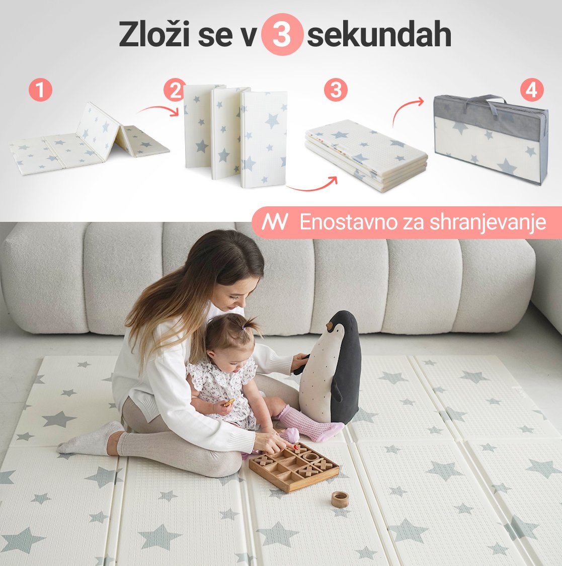 PREVODEN SLOG: Otroka lahko očarate z igralno podlogo, ki ima dve strani. Na eni je čudovit vzorec oblakov, ki spodbuja razvoj otrokovih sposobnosti, na drugi strani pa je eleganten in nevtralen vzorec, ki se lepo poda k opremi vašega doma.