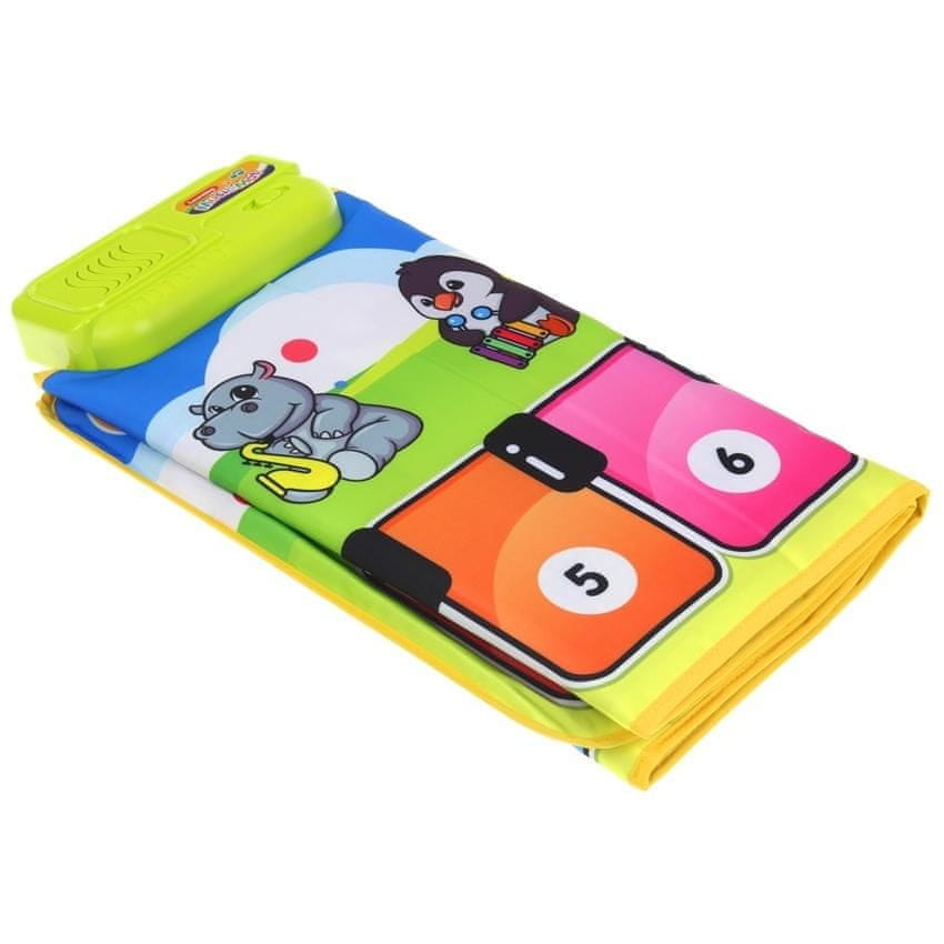S tem klavirjem si želite igrati in plesati. Po vklopu vas bo pozdravila vesela melodija. Vse tipke in ikone na podlogi se aktivirajo s pritiskom. Ta odlična glasbena in gibalna igrača vam omogoča igranje skladb, ki ste jih sestavili. Z gumbom mikrofona lahko posnamemo melodijo in jo večkrat predvajamo zahvaljujoč gumbu poleg njega. Poleg tega ima igrača stopničasto regulacijo glasnosti, prej posneta melodija pa izgine iz spomina, ko igračo izklopite. Na vrhu, na sredini podloge, je pritrjena zelena škatla, v kateri je zvočnik in dodatna funkcija za vklop in izklop. Zahvaljujoč interaktivni podlogi ima otrok možnost spoznavanja osnovnih zvokov in ritmov, raznolikost melodij in možnosti muziciranja pa lahko vpliva na razvoj umetniških sposobnosti.