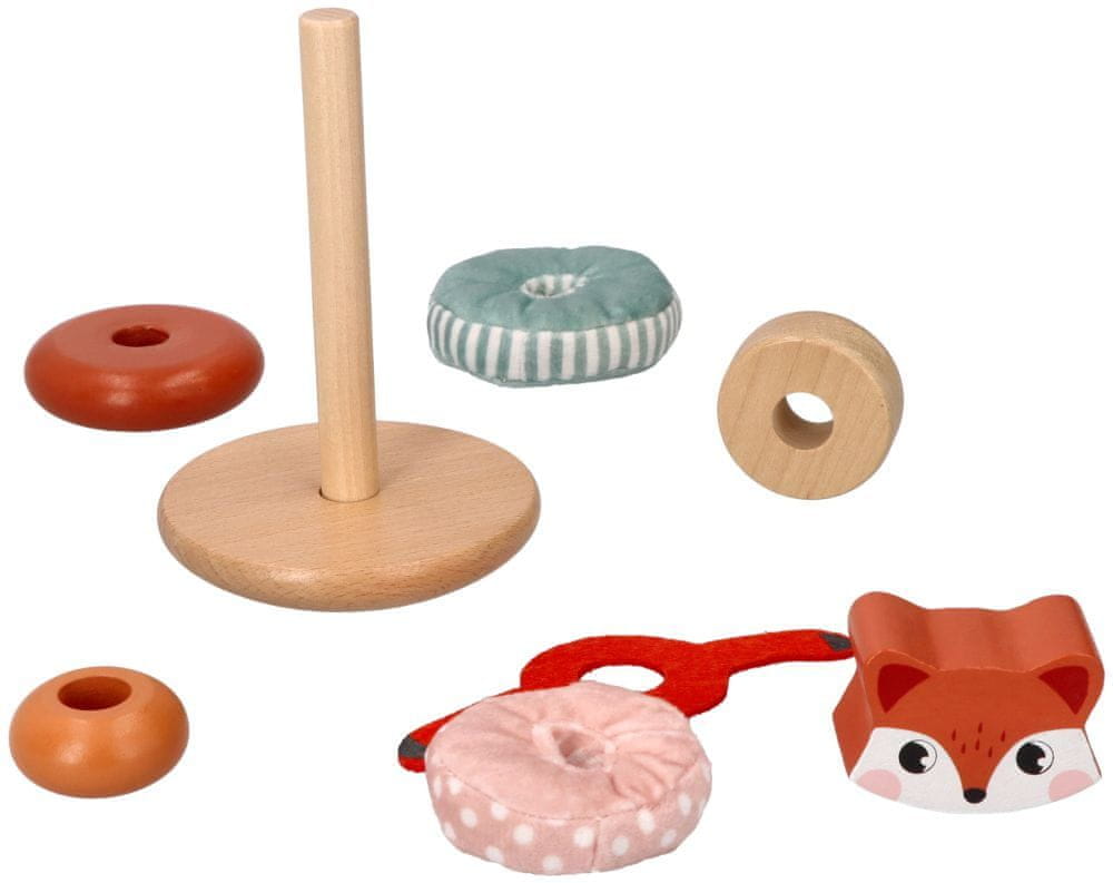 Senzorična piramida Adam Toys je klasična in izobraževalna igrača za otroke Igračo zaznamujejo čudovite barve in raznoliki materiali Sestavljena je iz lesenih diskov različnih velikosti, mehkih, otipnih materialov v roza in modri barvi ter lisičjih šap iz filca, ki jih je treba namestiti na ustrezna mesta Zahvaljujoč različnim teksturam in materialom igrača razvija otrokove senzorične sposobnosti