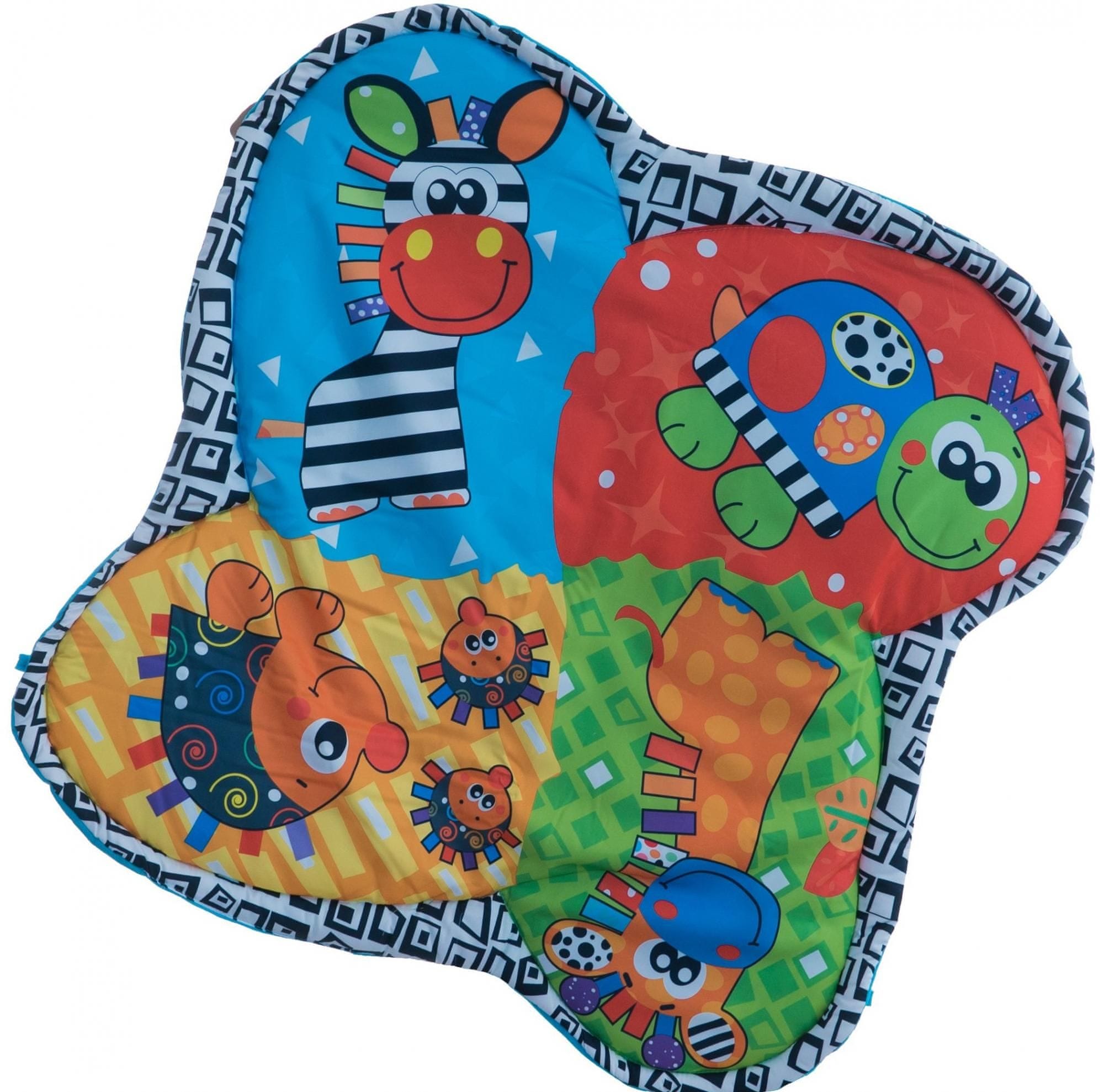 Prostorna in zelo mehka igračka z živalskim motivom je opremljena s številnimi aktivnimi elementi. Odeja vključuje 2 vodoravni palici za viseče igrače, na sredini katerih je sončno ogledalo. Celoten opis