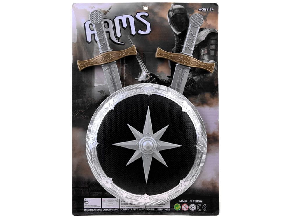Dva meča in obrambni ščit je komplet za vsakega malega viteza. Komplet je v celoti izdelan iz plastike. Komplet je v srebrni in črni barvi. Idealen komplet za vsakega malega viteza za žogo, za igro s prijatelji. Ščit z zvezdo na sprednji strani ima na spodnji strani udoben ročaj za držanje. Meč je lahek, v notranjosti je votel, zato ni možnosti, da bi se igrača poškodovala.