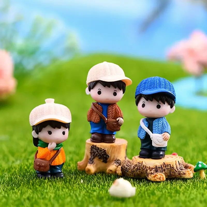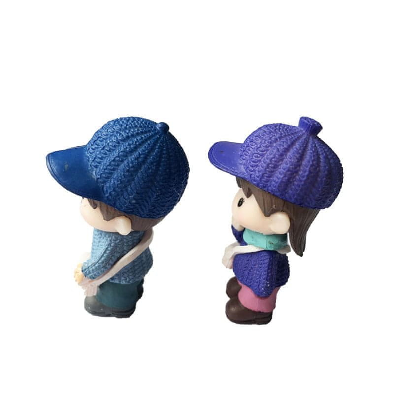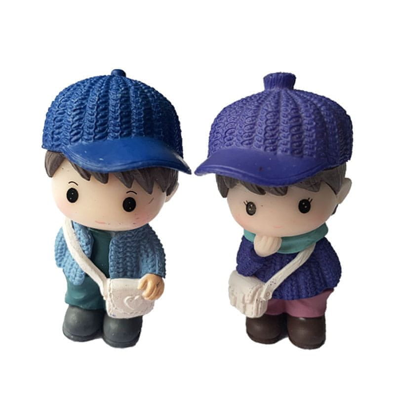 Dekle – vijoličen pulover in baseball kapa, roza kratke hlače. Bela torba, obešena čez ramo.