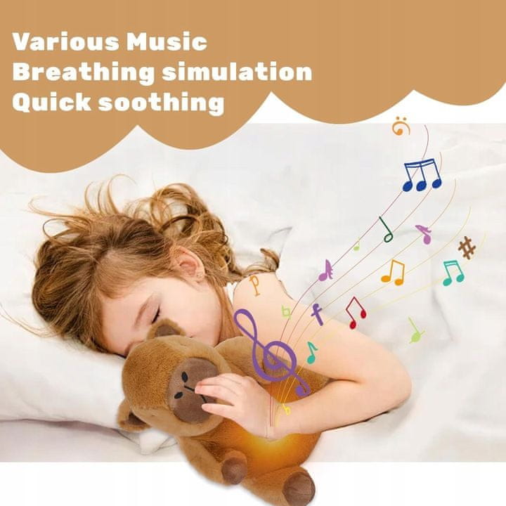 Spalna igrača: Brenčanje Capybara Capybara Breathing Soothing Toy je prikupna mehka igrača za najmlajše, ki pomiri vašega dojenčka in mu pomaga zaspati. Njegov mehak trebušček se dviga in spušča ter posnema dihanje in naravno pomirja vašega malčka. Igrača ponuja 30 minut pomirjujoče glasbe in zvokov, skupaj z mehko svetlobo. Zaradi prikupnega videza vidre in mehkih materialov je popoln spremljevalec pri spanju.- Očarljiva in mehka kapibara- Prenosna in udobna za uporabo- 11 funkcij, ki spodbujajo čute za vid, sluh in dotik- Posnema dihalne gibe, kar naravno pomirja dojenčka- Do 30 minut glasbe in zvokov (srčni utrip, sladko smrčanje, beli šum)- Nežna svetloba- Zagotavlja občutek varnosti- Popoln za uporabo doma ali med potovanjem – Stimulira dojenčkove čute – Poganja ga 3×AAA (ni priložen) Dodatne funkcije: – Glasbo lahko aktivirate s pritiskom na tačko – Diha – mehak trebušček se ritmično dviga in spušča, kar naravno pomirja dojenčka. – 3 minute pomirjujoče glasbe in drugih zvokov (srčni utrip, smrčanje, beli hrup). – Zahvaljujoč sladkemu obrazu, mehak material, in satenast rep, je kot nalašč za spanje.- Barva: svetlo rjav pliš. Set vsebuje: Plišasto kapibaro. Brez škatle – to je različica OEM (nizka prodajna cena) Izobraževalne vrednosti: – Senzorične: mehki materiali, pomirjujoča glasba in luči ter ritmični gibi razvijajo čute dotika, vida in sluha, medtem ko otroka sproščajo. – Dobre navade: Ta čudovita ljubkovalna igrača lahko postane del vaše vsakodnevne rutine pred spanjem in pomaga ustvariti ritual pred spanjem. – Varnost in zadovoljstvo: s svojim čudovitim obrazom, pomirjujočimi gibi in nežno glasbo bo kapibara pomagala …