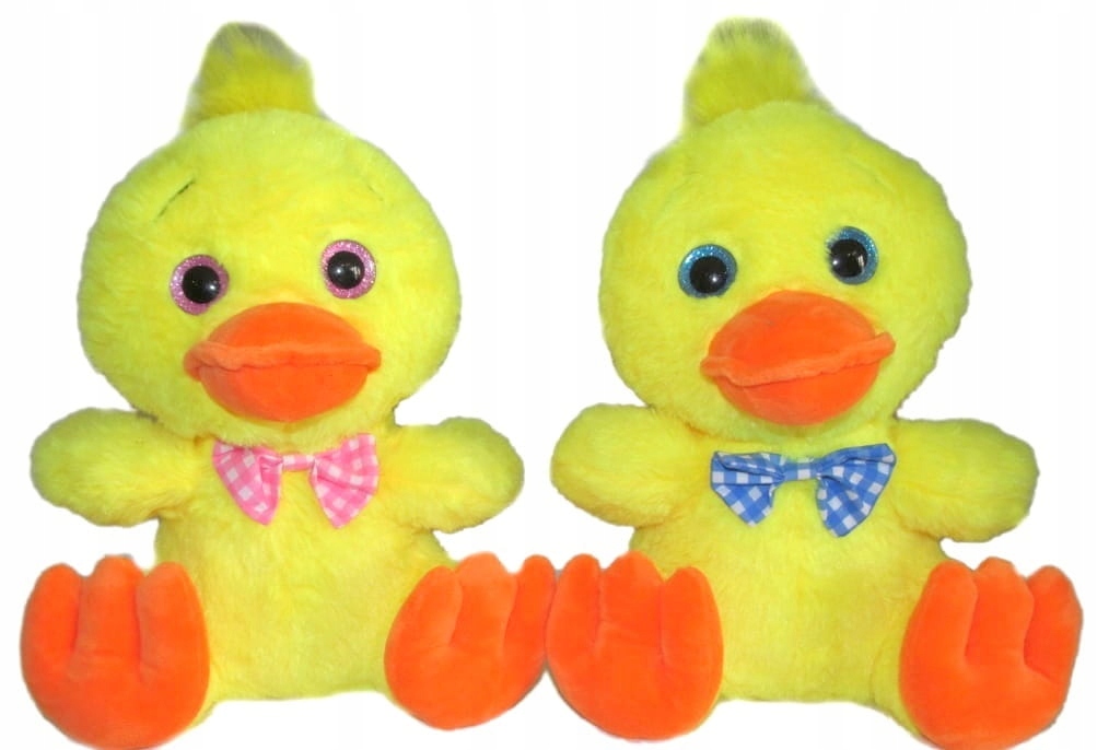 Račka nosi ljubko pentljo (modro ali roza) in ima čudovite lesketajoče se oči v barvi, ki se ujema s pentljo.