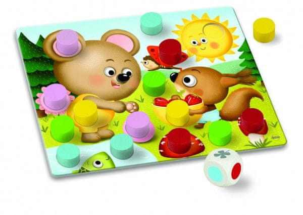 Kamne po metanju kocke položite v predloge. Cilj igre je napolniti kartico s 15 barvnimi valjčki. Vsak igralec vzame 1 papirnato kartico in 15 valjčkov – po tri od vsake barve. Igralci se v igri menjavajo – met kocke določi, kateri barvni valjček lahko igralec postavi na svojo kartico. Paket vsebuje: 60 barvnih valjčkov, 1 kocko, 4 papirnate kartice. Primerno za otroke od 4. leta starosti