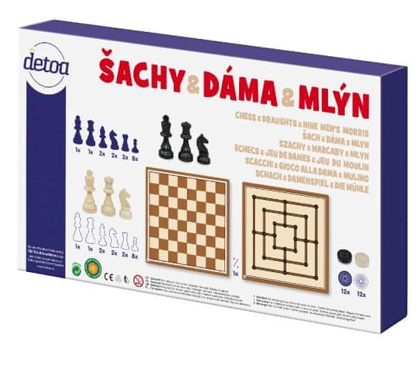Komplet vsebuje tri priljubljene družabne igre: šah, dama in mlin. Celoten opis