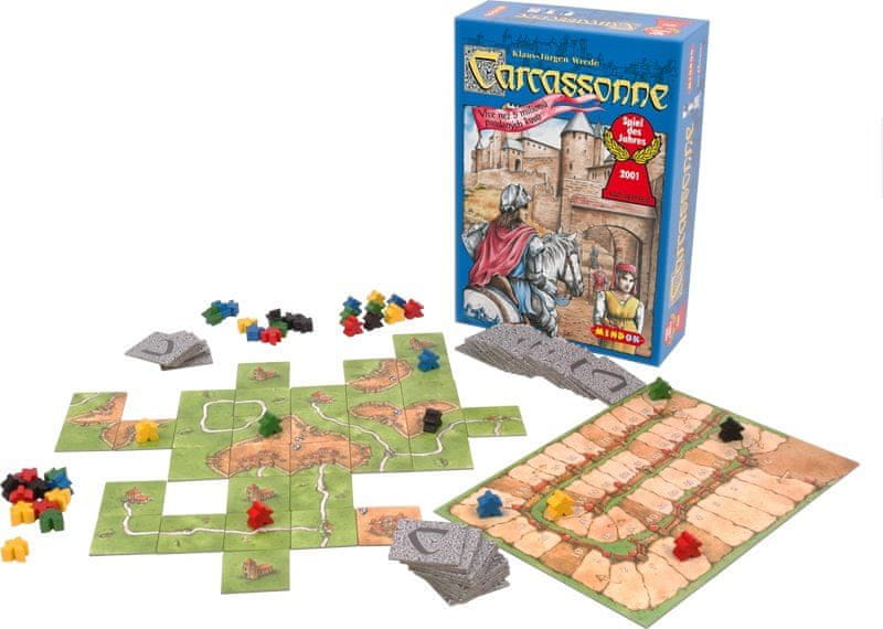 Ena najbolj priljubljenih namiznih iger na svetu. Igralci se s svojo druščino odpravijo na ceste in travnike, mesta in samostane ter iščejo srečo v okolici mesta Carcassonne. Videz pokrajine je v njihovih rokah, strateška razporeditev druščine, bodisi kmetov, roparjev, menihov ali vitezov, pa določa pot do uspeha. Igralci drug za drugim razporedijo karte s tematiko pokrajine. Nastajajo ceste, mesta, travniki in samostani, na katere lahko igralci postavijo svoje figure in zbirajo točke. Točke se štejejo med igro in na koncu igre, zato je zmagovalec znan šele po končnem štetju.