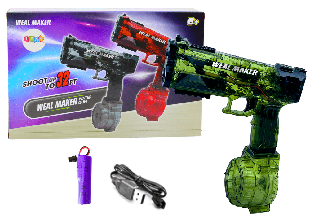 Vodna pištola Automatic Electric Green Avtomatska zelena vodna pištola je napredna igrača, ki poskrbi za izjemno razburljivo zabavo v vročih dneh. Pištolo, izdelano iz trdnega materiala, odlikuje visoka vzdržljivost in dodelani detajli, ki zagotavljajo ne le estetski videz, ampak tudi dolgotrajno uporabo. Ena izmed ključnih prednosti te pištole je delovanje na baterije. Zahvaljujoč uporabi baterije naprava ponuja visoko moč vodnega curka, kar pomeni dolgotrajne zabavne in učinkovite posnetke. Domet vodnega toka je do 10 metrov, kar zagotavlja dinamično zabavo in omogoča ciljanje na oddaljene cilje. Pištola je opremljena s prozorno posodo za vodo, kar je praktična rešitev, ki omogoča stalen nadzor nivoja vode. Zahvaljujoč temu uporabnik vedno ve, kdaj mora napolniti posodo, kar omogoča nemoteno zabavo. Dizajn zelene vodne pištole ni samo moderen, ampak tudi ergonomski, kar zagotavlja udobno držanje in natančno usmerjanje vodnega curka. Zaradi trdne konstrukcije in visokokakovostnih materialov je pištola odporna na poškodbe in popolna za intenzivno igro na prostem. Popolna za igro na vrtu, plaži ali bazenu, avtomatska vodna pištola je popolna izbira za vse, ki želite v celoti uživati v poletnih dneh. Zaradi svoje funkcionalnosti, moči in estetskega videza je odlična izbira za otroke in odrasle, željne zabave v vročih dneh. Pištolo napaja baterija 3,7V 1200mAh, ki je priložena v kompletu. Bateriji je priložen polnilec. Mere pištole: 26 cm x 19 cm Dimenzije embalaže: 34,5 cm x 22,5 cm x 10 cm Certificirano CE in skladno s standardom EN71. Namenjeno otrokom starejšim od 8 let.