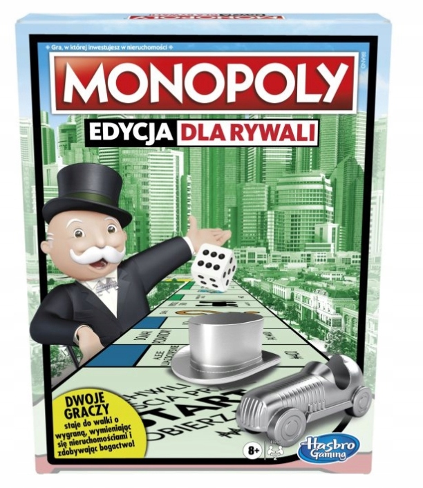 Monopoly Rivals Edition je igra, v kateri se dva igralca pomerita za zmago tako, da menjata nepremičnine in se obogatita! Karte Skupnostne skrinje in Naključje povečajo napetost, ko igralca poskušata osvojiti vse nepremičnine na plošči ali spraviti nasprotnika v bankrot. Ta igra Monopoly za dva igralca traja manj časa kot klasična igra Monopoly. Je odlična izbira za zmenek, aktivnost v deževnem dnevu ali kadar koli si vaši otroci želijo igre s prijateljem.